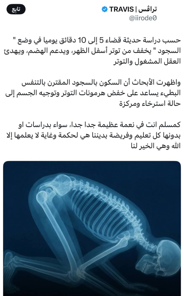 فذكر منافع صحية للسجود، وما ذكره من سرور النفس يتقاطع مع ما في الدراسة من خفض التوتر، غير أن أعظم ما يذهب التوتر الإقبال على الله عز وجل ودعاؤه واستغفاره.