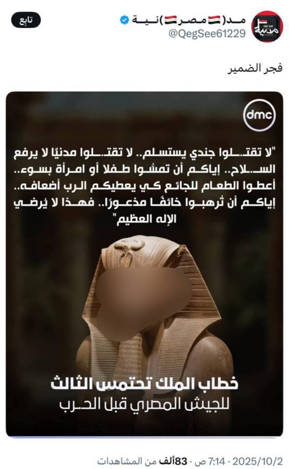 فالكلام اللي في الصورة مقتبس من وصايا الإسلام في الحرب، مش من النقوش المصرية.. وإحنا محتاجين نفرّق بين الفخر المشروع بالماضي، وبين اختراع نصوص مالهاش سند علشان نجمّل الصورة”.