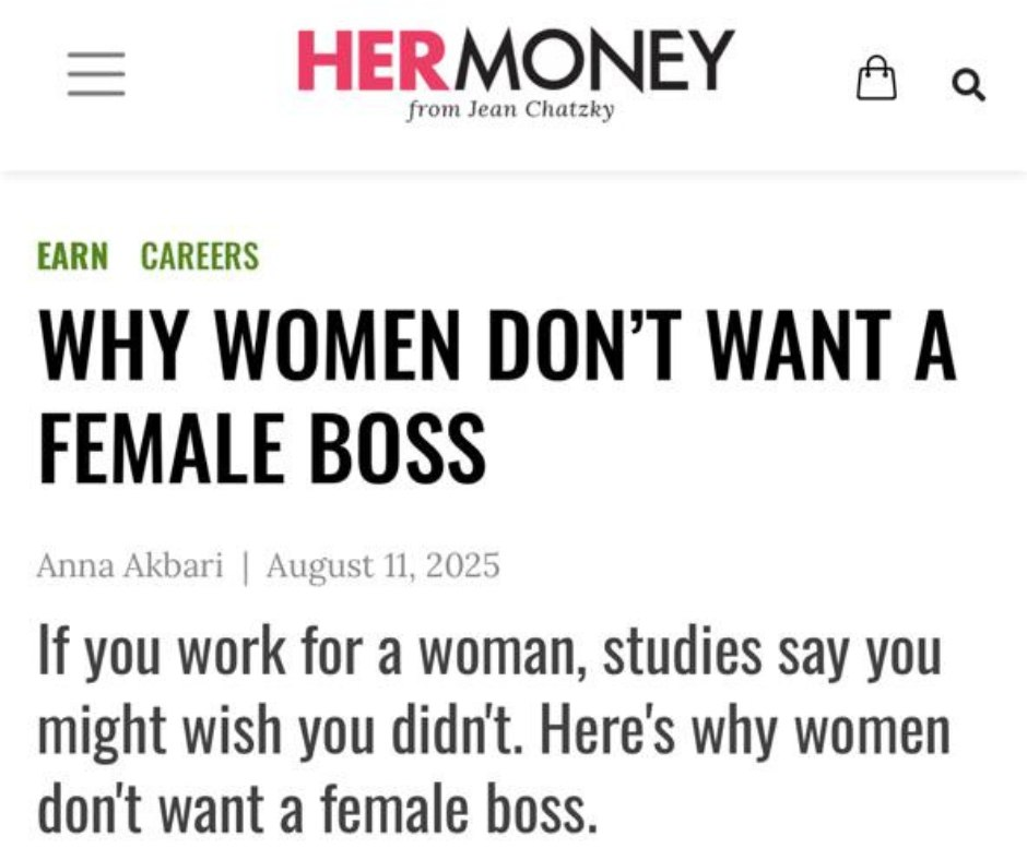 تقول في مقالها المشار إليه: “قصص المديرات السيئات: تروي لي العديد من الطالبات السابقات والزميلات الأصغر سناً من جميع أنحاء البلاد قصصاً مرعبة عن تجاربهن مع المديرات عند دخولهن سوق العمل. فبدلاً من التوجيه الذي يتوقعنه، يتلقين إهانات سلبية عدوانية وتعليقات متعالية. ونتيجة لذلك، تعترف هؤلاء الشابات ذوات الميول النسوية، مع الأسف، بأنهن يفضلن العمل مع رجل لأن رؤساءهن الرجال لا يعاملونهن بهذه الطريقة بل هم أكثر ميلاً لترقيتهن”.