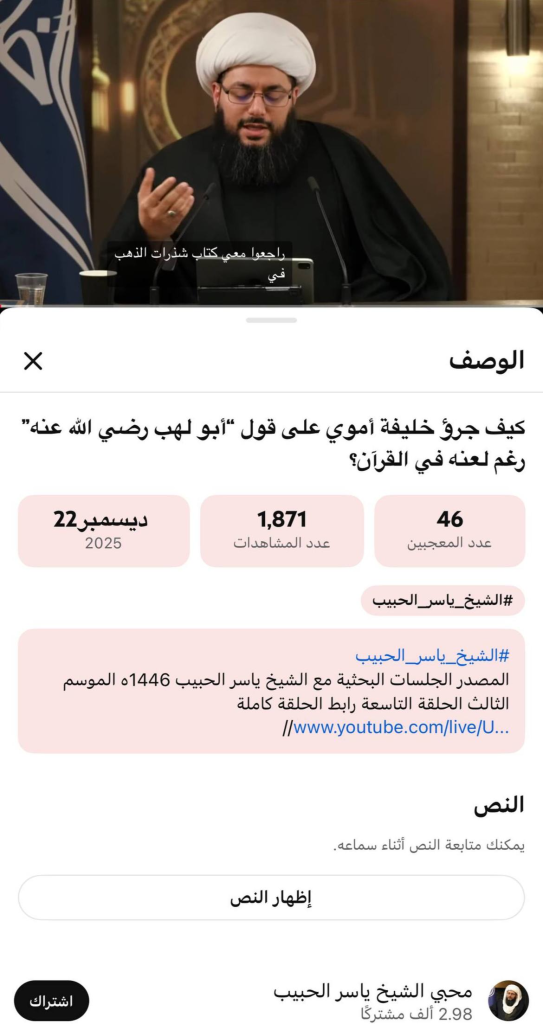 ياسر الحبيب يتكلم عن يزيد بن عبد الملك بن مروان، ويزعم أنه ترضى عن أبي لهب، وذلك في رواية لمؤرخ حنبلي.